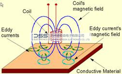 渦流檢測就是運(yùn)用電磁感應(yīng)原理,將正弦波電流激勵探頭線圈,當(dāng)探頭接近金屬表面時,線圈周圍的交變磁場在金屬表面產(chǎn)生感應(yīng)電流。對于平板金屬,感應(yīng)電流的流向是以線圈同心的圓形,形似旋渦,稱為渦流。同時渦流也產(chǎn)生相同頻率的磁場,其方向與線圈磁場方向相反。