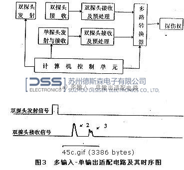 正交檢測方案要求對同一點進行兩組探頭測量。為了兩組超聲波不混疊,兩組探頭應先后分別測量,兩個回波的后期處理基本相同,而工廠現有CTS-23型單通道探傷儀,為了用一個通道來處理兩路信號(采用單通道探傷儀),設計了多輸入-單輸出的適配電路。電路框圖如圖3(a)所示,工作原理是:在計算機的控制之下,控制單元首先讓雙探頭發(fā)射,延時一定時間,打開雙探頭多路轉換通道,使雙探頭接收到的信號經過預處理后,通過多路轉換器進入探傷儀進行處理及后期特征提取,然后關閉雙探頭通道,讓單探頭發(fā)射,延時一定的時間后,打開單探頭多路轉換通道,讓單探頭接收的疵病信號,經過預處理后,通過多路轉換器進行后期處理(始波信號通不過),然后關閉單探頭通道,完成此次的檢測工作 (藥筒轉到下一點時重復以上步驟) 。其工作時序圖如圖3 (b)所示。回波信號中,1為始波,2為有用信號波,3為干擾信號,干擾信號幅值時大時小,有時不出現,單探頭的疵病信號是隨著藥筒轉動而逐漸向始波移動,當移到某一點時幅值大。