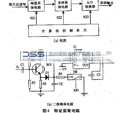 因為探傷儀處理后的回波信號是時域上變化很快的脈沖信號,信號過去后,為了保持住信號的峰值進行A/D轉換,設計了如圖4所示的兩級采保電路。級由分立元件( 高頻三極管和阻容等元件)組成,利用電容充電來采集峰值。信號到來時(SW斷開),通過D1給C2充電,由于D1的單向導電性,信號過去后,C2兩端的電壓等于信號的峰值,但C2的保持能力差,由集成采樣保持器LF398在級峰保的基礎上采保。所以對采集速度要求不高,它的保持特性很好,滿足A/D轉換的要求。