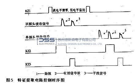 由于單、雙探頭組的回波信號中,不僅有有用信號,還有一些始波及干擾信號存在,所以須根據超聲波傳播的時間來控制峰保電路,使其保持有用信號的峰值,而使干擾信號不影響其輸出,在下一次采樣前,須使電容C2上的充電放掉(SW接通),為此設計的控制信號KZ1,KZ2,KZ3的時序如圖5所示。